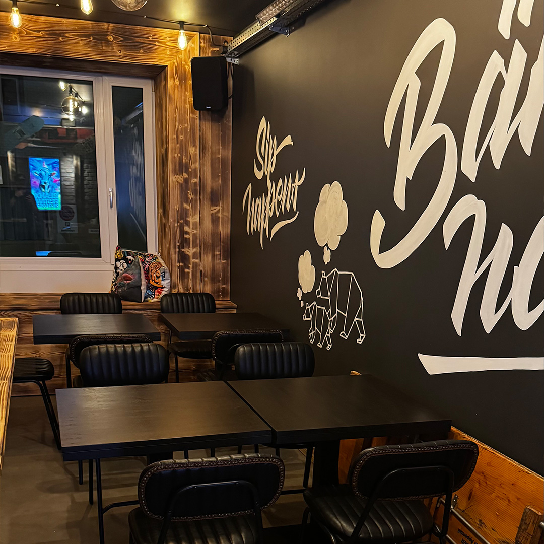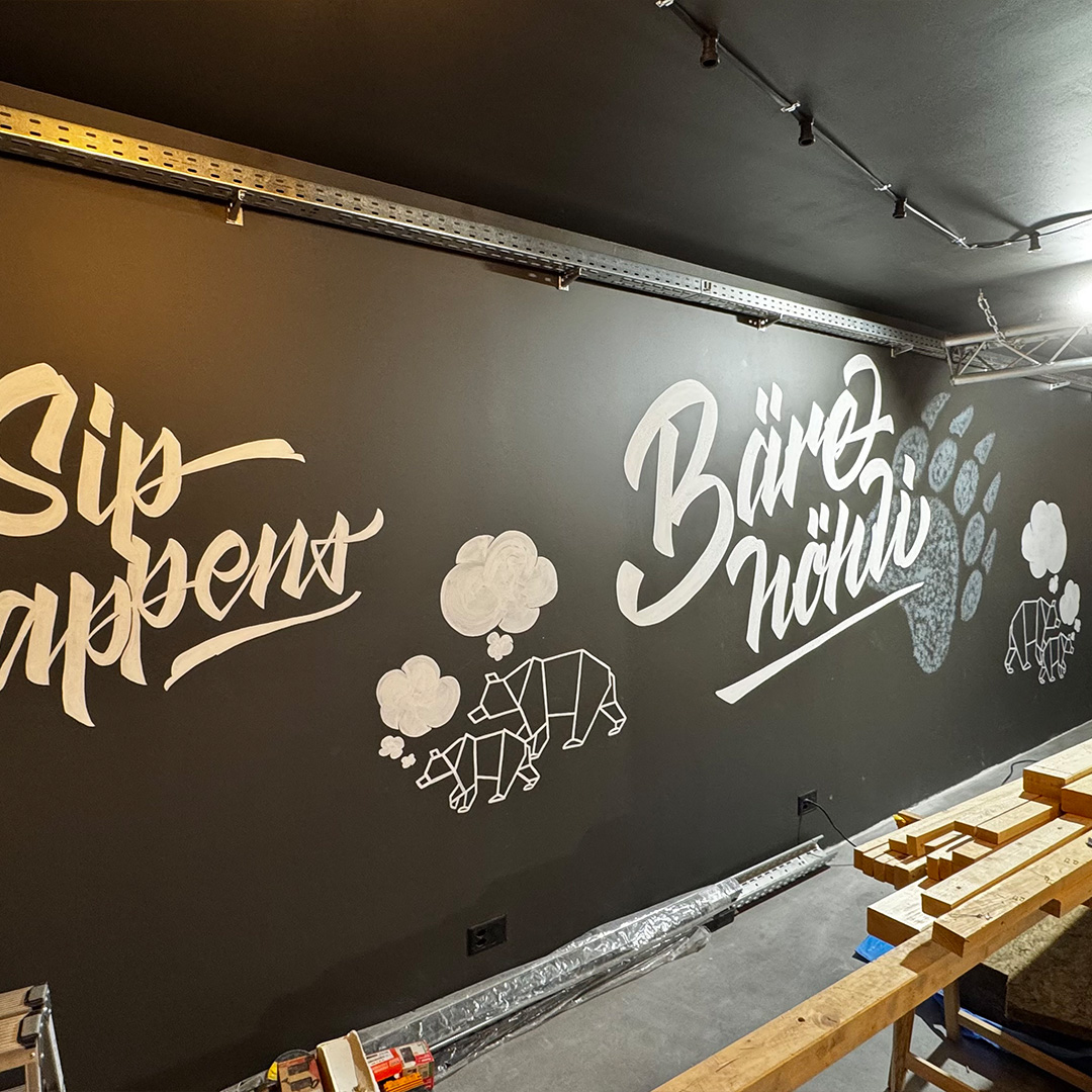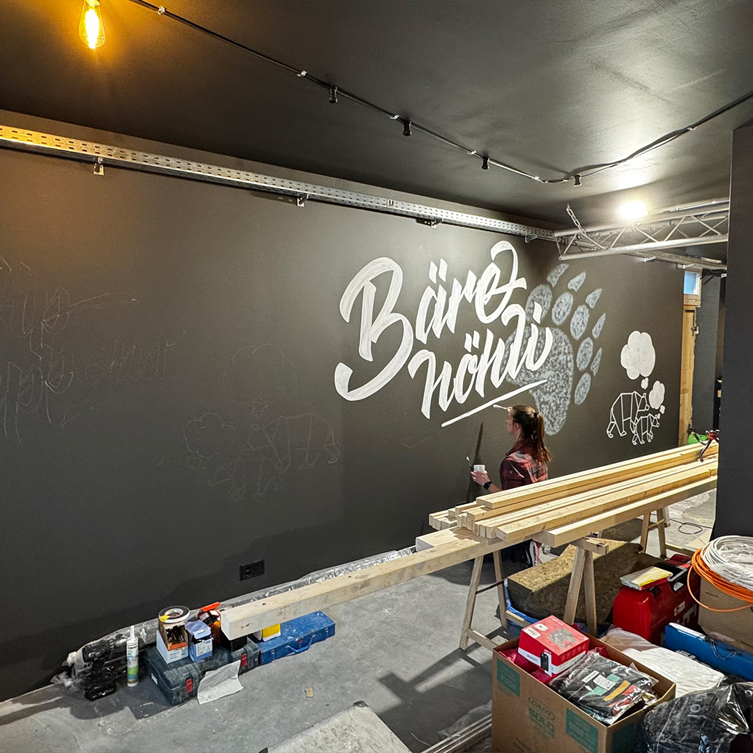 Schriftzug & Illustration: Jeder Bär braucht seine Höhle – so auch der Schwarzbär. Dieses Projekt umfasste zwei Wandgestaltungen mit Schrift und Illustration für die Bar Bärehöhli in Appenzell, bei denen ich grösstenteils freie Hand hatte.